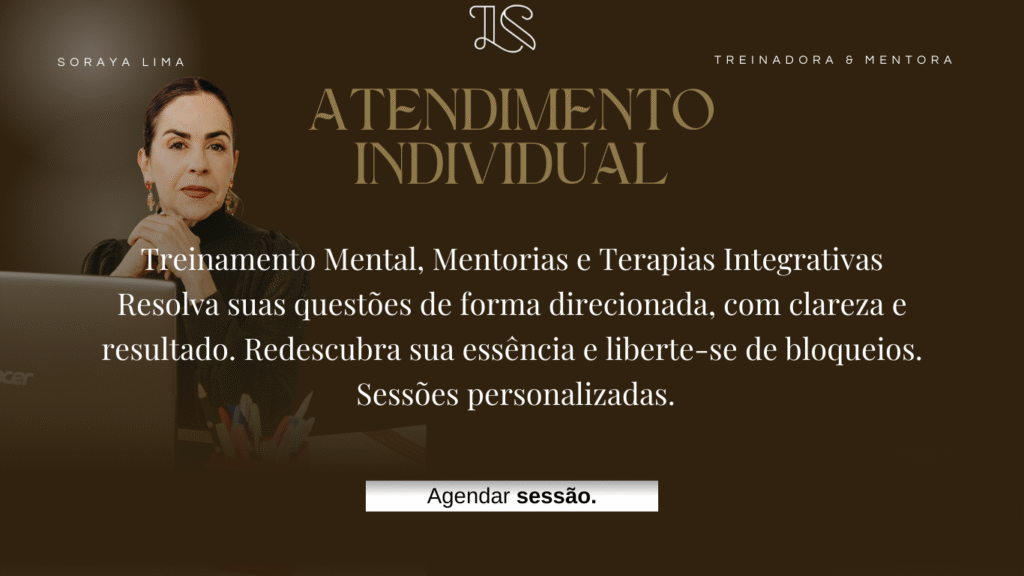 Sou Soraya Lima, treinadora mental, mentora comportamental e terapeuta integrativa. Minha missão é unir ciência e espiritualidade para ajudar pessoas e empresas a despertarem o seu potencial pleno — aquele que nasce quando a mente se aquieta e a consciência desperta.